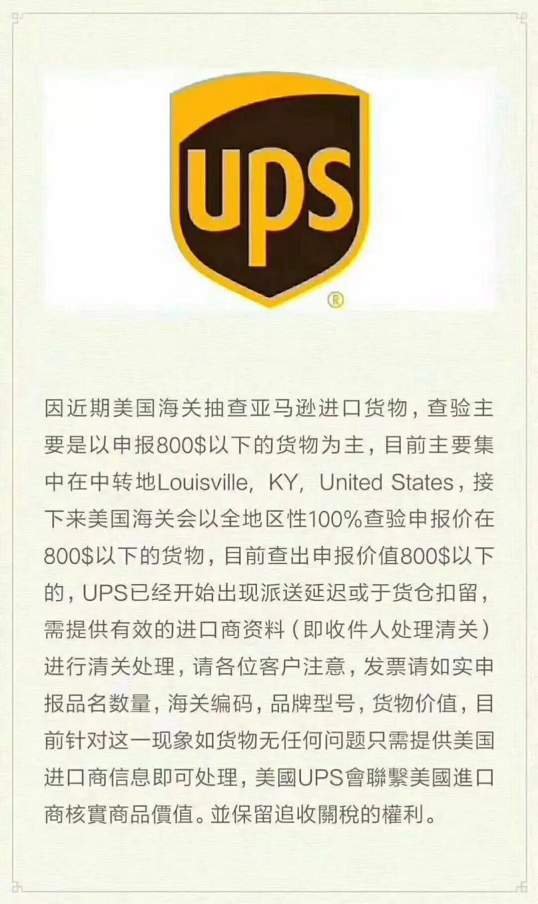 UPS反馈,因近期美国海关抽查亚马逊进口货物,查验主要是以申报800$以下的货物为主,目前主要集中在中转地Louisville, KY, United States,接下来美国海关会以全地区性100%查验申报价在800$以下的货物,目前查出申报价值800$以下的,UPS已经开始出现派送延迟或于货仓扣留,需提供有效的进口商资料(即收件人处理清关)进行清关处理。