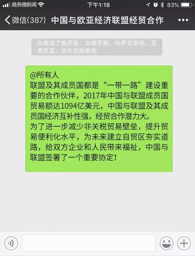 2017年10月1日,中国商务部部长钟山在杭州与欧亚经济委员会贸易委员尼基申娜举行会谈,并共同签署《关于实质性结束中国与欧亚经济联盟经贸合作协议谈判的联合声明》。