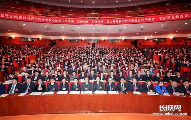 河北会堂大礼堂内,灯光璀璨,气氛热烈。主席台正中悬挂着象征各族人民大团结的政协会徽,在十面红旗的映衬下熠熠生辉。会场内高高悬挂的大红条幅上写着:紧密团结在以习近平同志为核心的党中央周围,开拓创新、拼搏竞进,奋力谱写新时代全面建设经济强省、美丽河北新篇章!