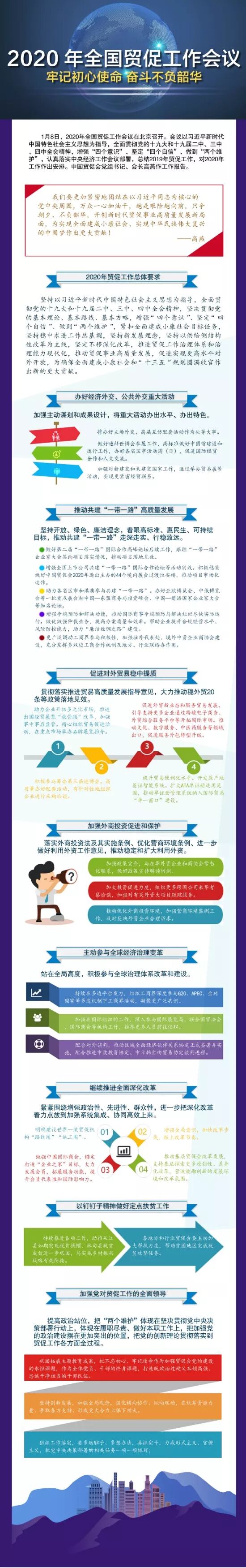 1月8日,2020年全国贸促工作会议在北京召开。会议以习近平新时代中国特色社会主义思想为指导,全面贯彻党的十九大和十九届二中、三中、四中全会精神,增强“四个意识”、坚定“四个自信”、做到“两个维护”,认真落实中央经济工作会议部署,总结2019年贸促工作,对2020年工作作出安排。