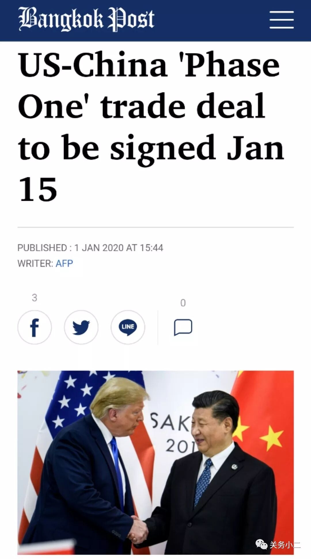 美国时间12月31日,特朗普通过社交平台称,2020年1月15日特朗普会在白宫和中方高层代表一同签署第一阶段协议
