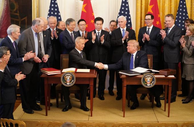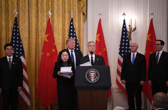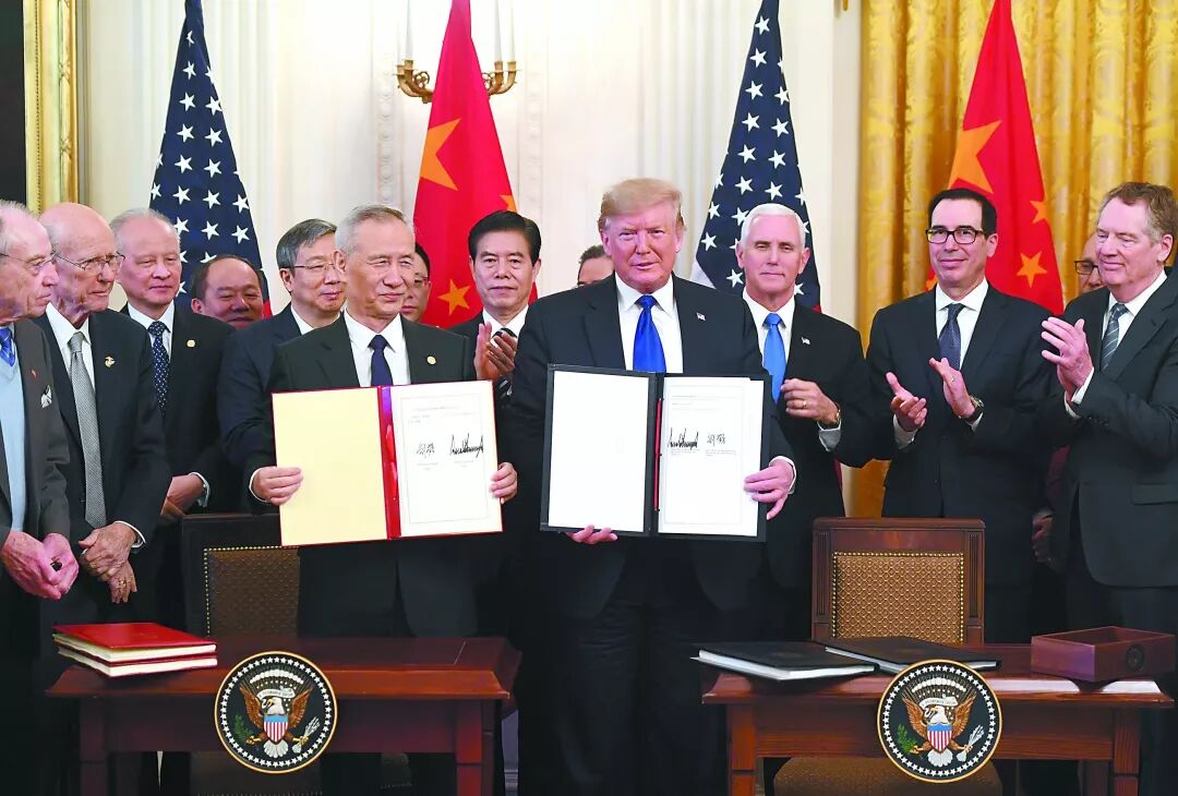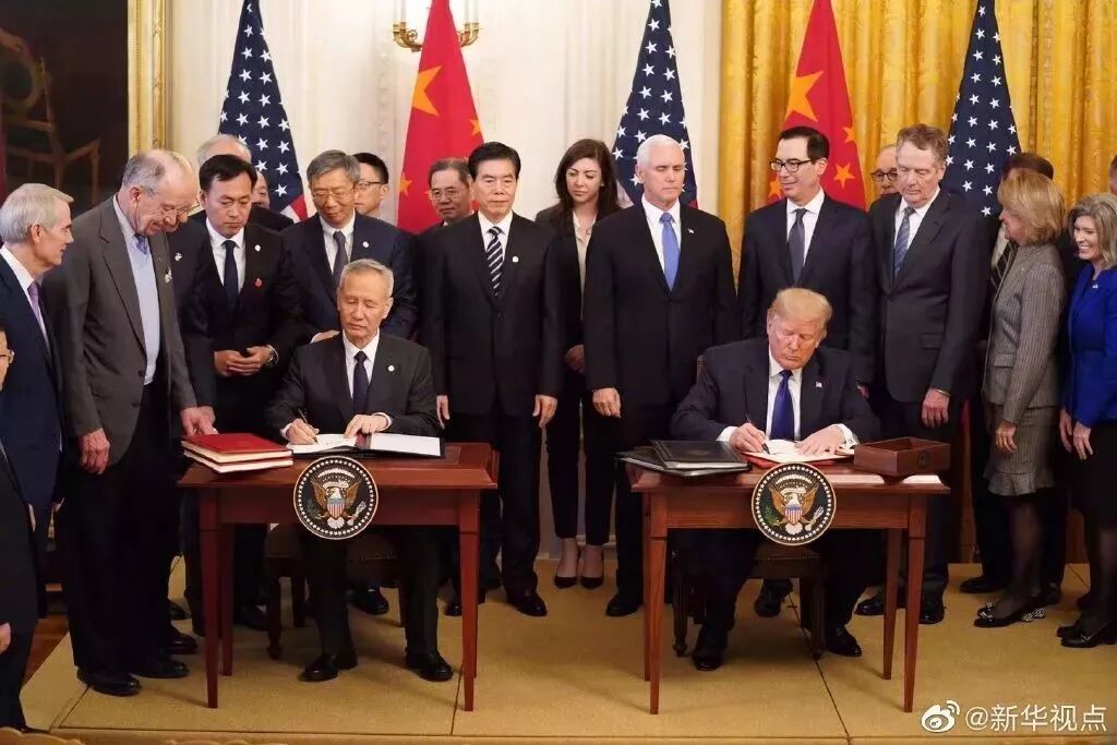 华盛顿当地时间1月15日上午,中美第一阶段经贸协议签署仪式在美国白宫东厅举行。中共中央政治局委员、国务院副总理、中美全面经济对话中方牵头人刘鹤与美国总统特朗普共同签署协议文本并致辞。