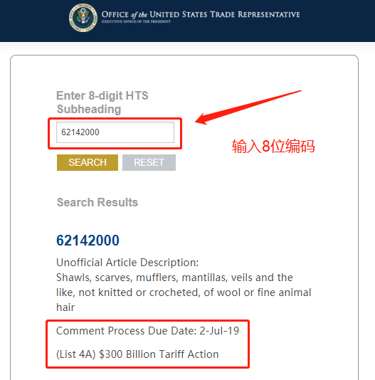 在最后一行“Search Tariff Lists”这里,打开此链接页面最下面,在对应查询框里输入“8位HTS码”则可以查询具体产品是否加税、何时开始加税。