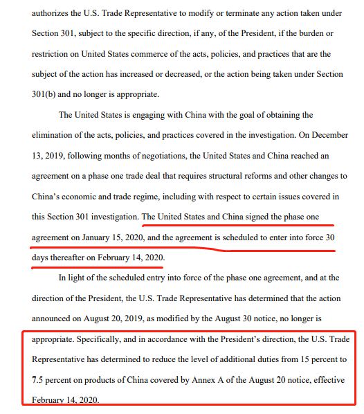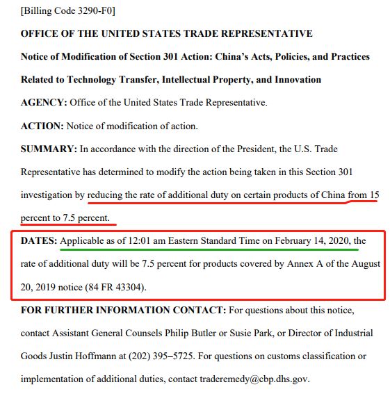 紧接着,美国贸易代表办公室(USTR)也发布公告,决定自美国东部时间2020年2月14日上午12:01起,美国3000亿List 4A清单加征关税从15%降至7.5%正式生效。并取消原定于12月15生效的3000亿List 4B清单关税。