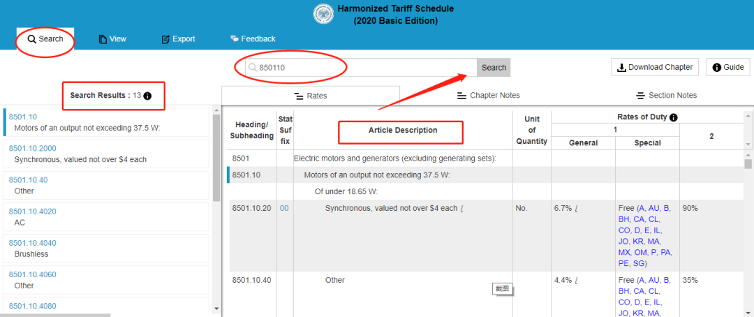 进入上述网站,在搜索框中输入中国HS CODE的前六位数,如台灯940520****,根据产品描述选择准确的HTS CODE。