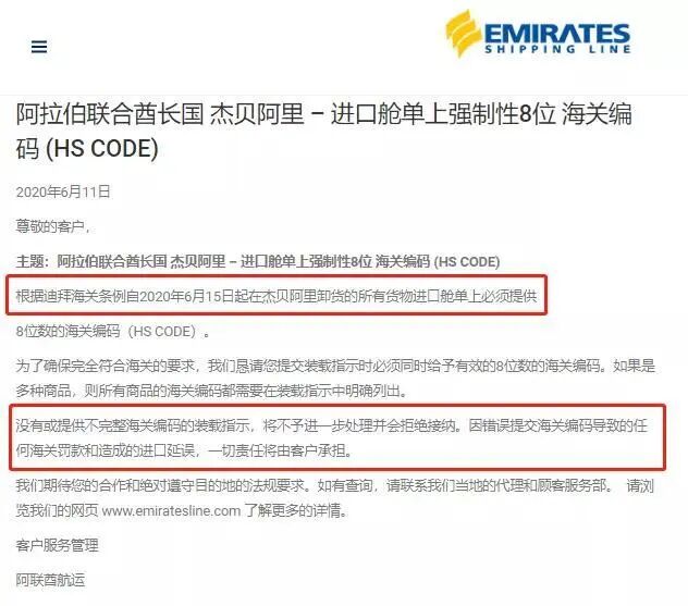 根据迪拜海关条例自2020年6月15日起在杰贝阿里卸货的所有货物进口舱单上必须提供8位数的海关编码(HS CODE)。