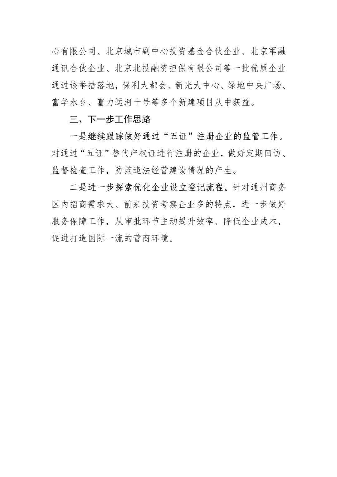 通州区运河商务区在项目主体出具书面承诺书的前提下,允许已建成、但尚未取得产权证的商业联合体凭土地、规划等“五证”为入驻企业办理营业执照,将企业入驻时间平均提前一至两年;