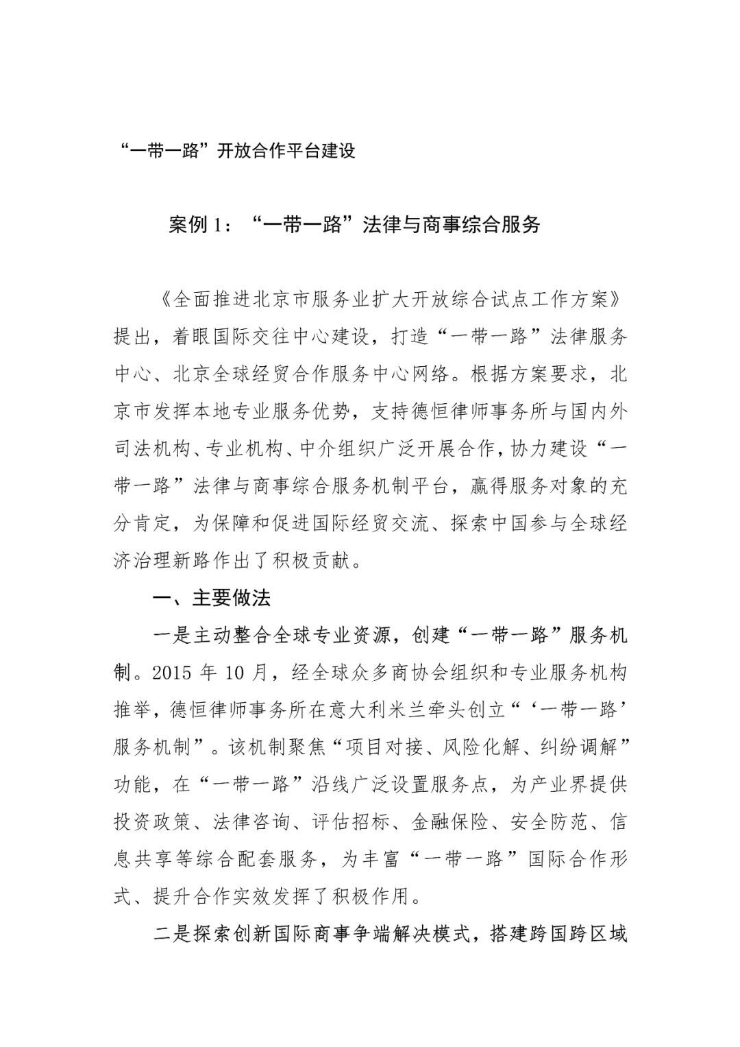 北京市支持律师事务所与全球司法机构、商协会和专业机构合作,牵头建设多国多方、线上线下、综合配套的法律商事服务机制,服务范围覆盖60多个国家180多个城市,为推进共建“一带一路”高质量发展作出了新贡献;