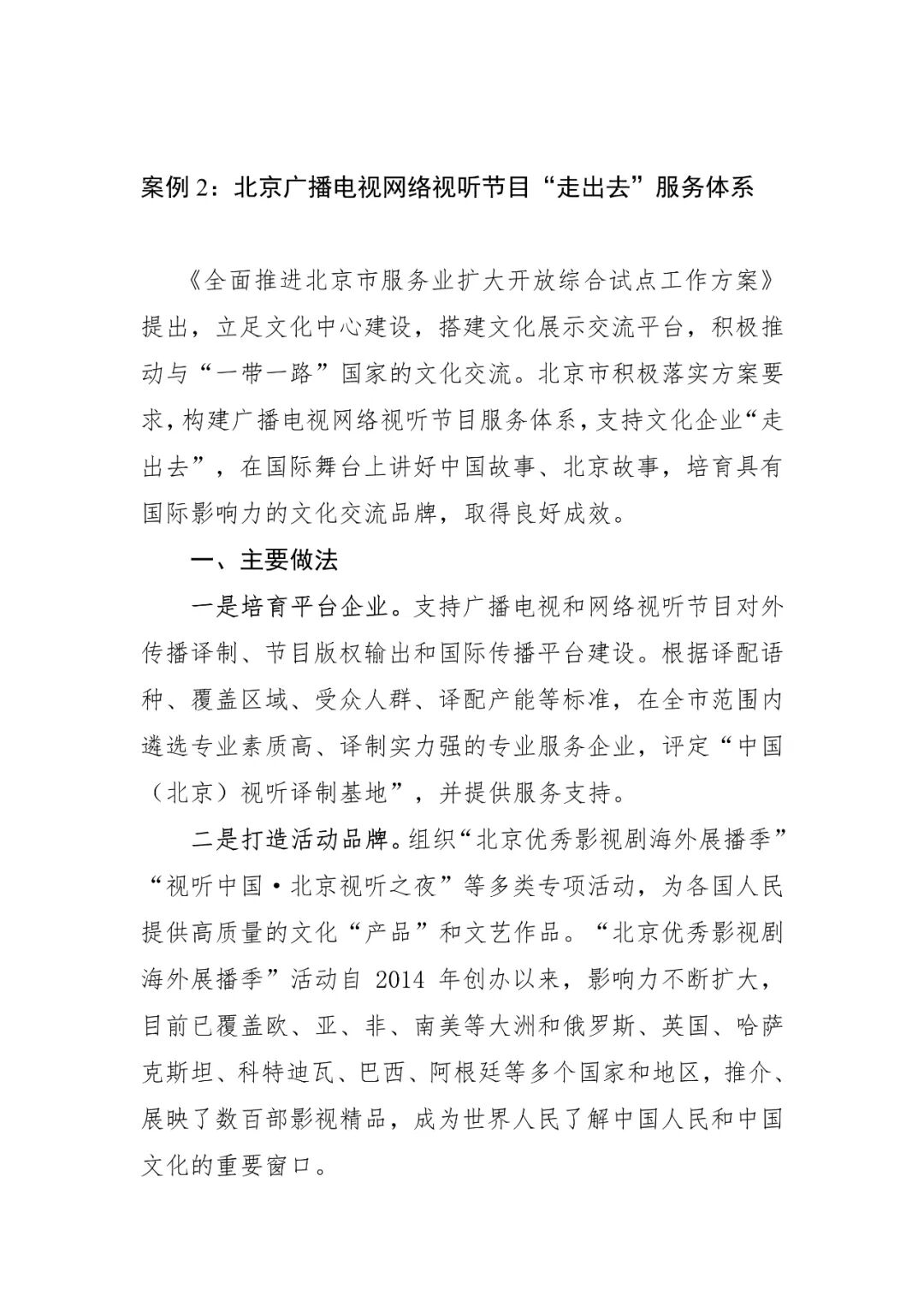 建设广播电视网络视听节目服务体系,支持文化企业“走出去”,讲好中国故事,仅一家龙头企业就在37国开办展播频道480多个,服务用户2700万人;