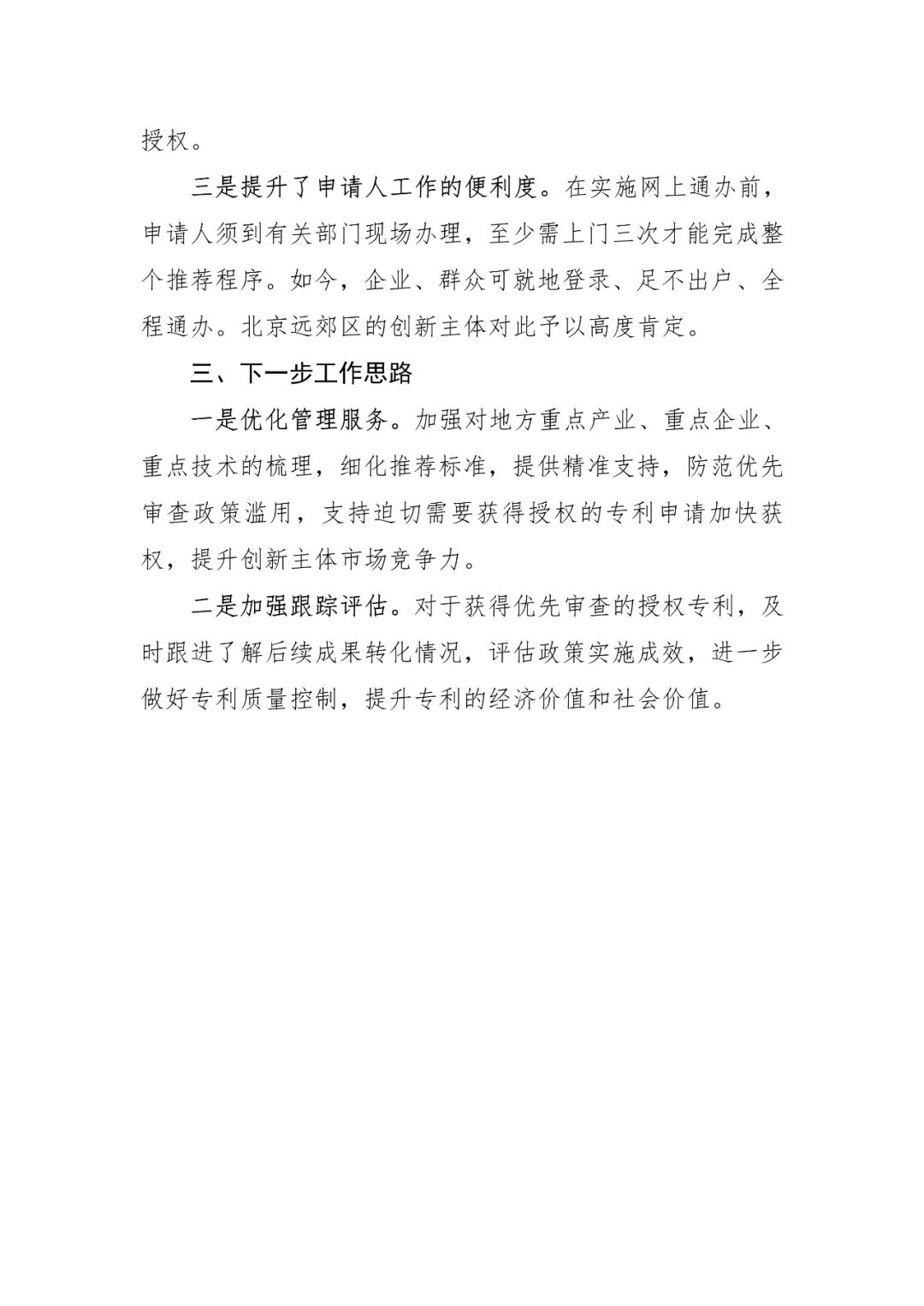北京市与国家知识产权局对接,开通企业专利申请优先审查“绿色通道”,将专利授权周期缩短三分之二以上,有力支持了“双创”企业发展;
