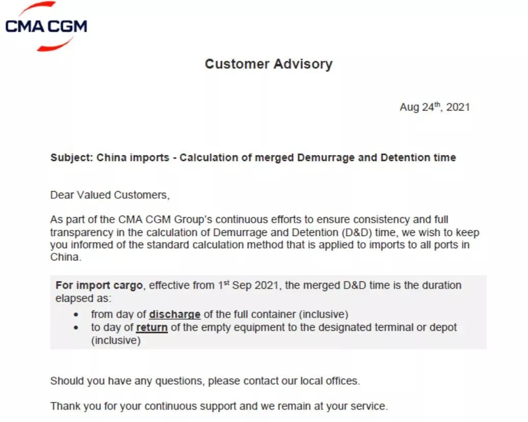 达飞中国通知,自9月1日起卸船的重集装箱,DEMURRAGE和DETENTION计费起算日期由原来的船舶靠泊日期改为集装箱实际卸船日期;计费结束日期保持不变,仍然为空箱返回船东指定堆场或码头的日期。