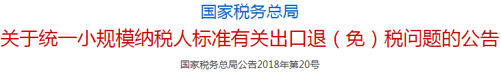 官方公告:国家税务总局4月22日发布的《关于统一小规模纳税人标准有关出口退(免)税问题的公告》(国家税务总局公告2018年第20号)
