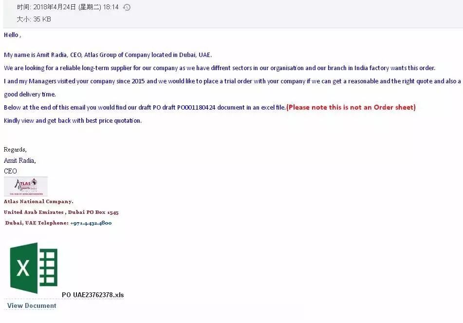 外贸相关的邮箱发各种各样的邮件,邮件标题经常会有以下题目:Account shutdown notice at 04/25/2018或者Atlas Group New Draft PO001180424 4/24/2018