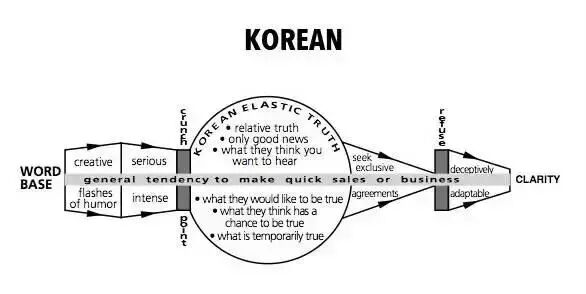 韩国人:喜欢尽快做成交易。他们只告诉客户某些事实,喜欢签独家协议,看似可接受,实际有些虚伪。