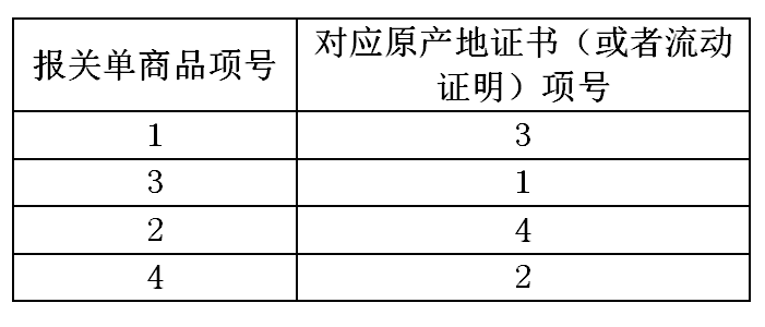 例如:报关单第1、3、2、4项为享受《中国东盟框架协议》项下优惠税率的货物,且其分别对应原产地证书(或者流动证明)第3、1、4、2项,则“单证对应关系表”应填写为: