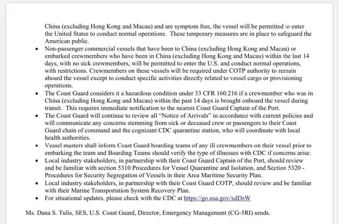 但美国大多数港口已经发布了船舶安全信息公告,要求近期停靠港中有中国的船舶进行补充报告,补充报告内容包括船员健康信息、以及与可能表现出类似于新型冠状病毒症状的个人进行潜在互动的报告。