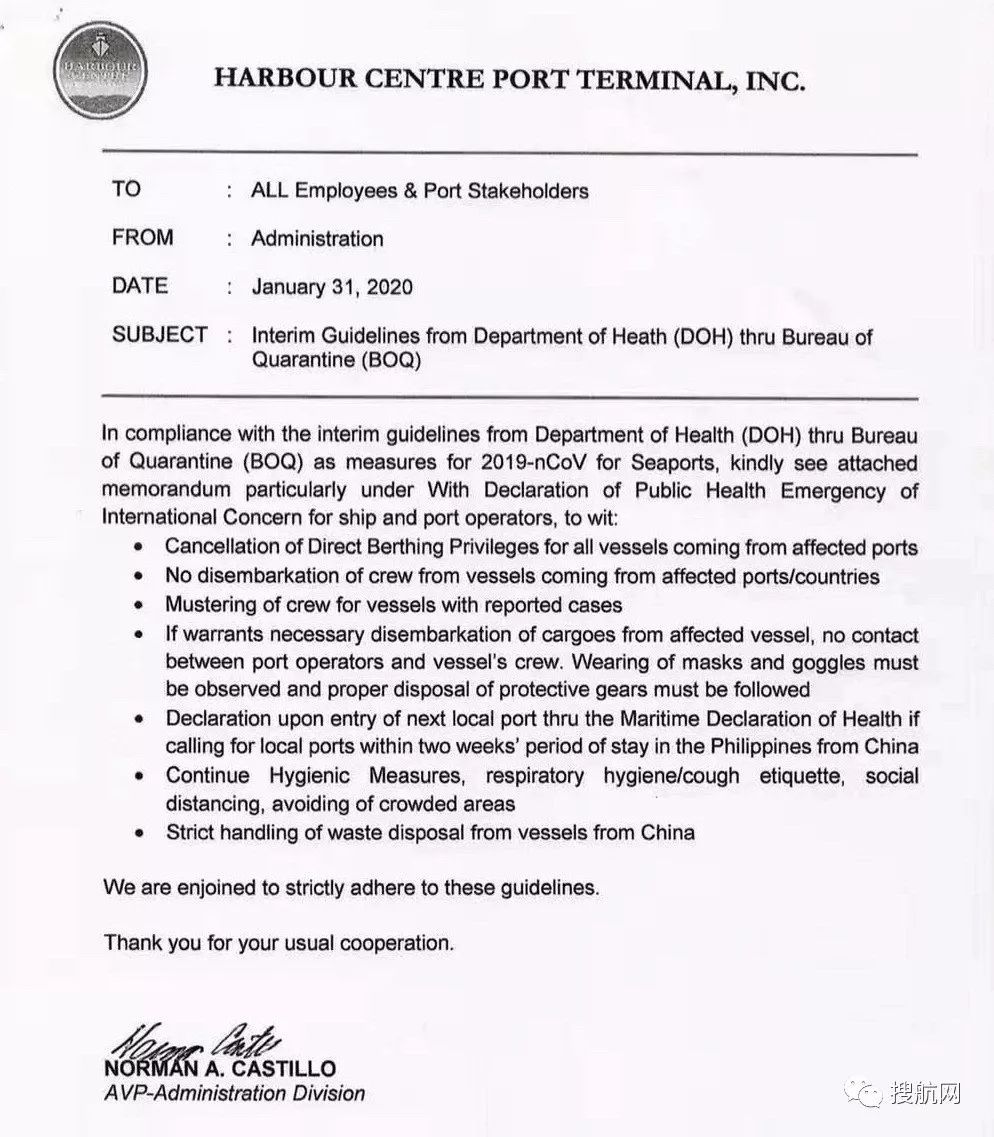 2月3日,菲律宾卫生部发布公告,将在所有港口对来自中国和受疫情影响病毒高发国家的船舶采取严格管控措施,具体措施如下: