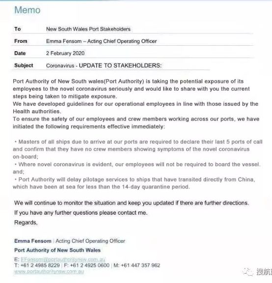 澳大利亚不同港口限制措施有所不同,比如新南威尔士港务局表示,新南威尔士港为保障港口雇员的健康安全,采取了如下多项措施: