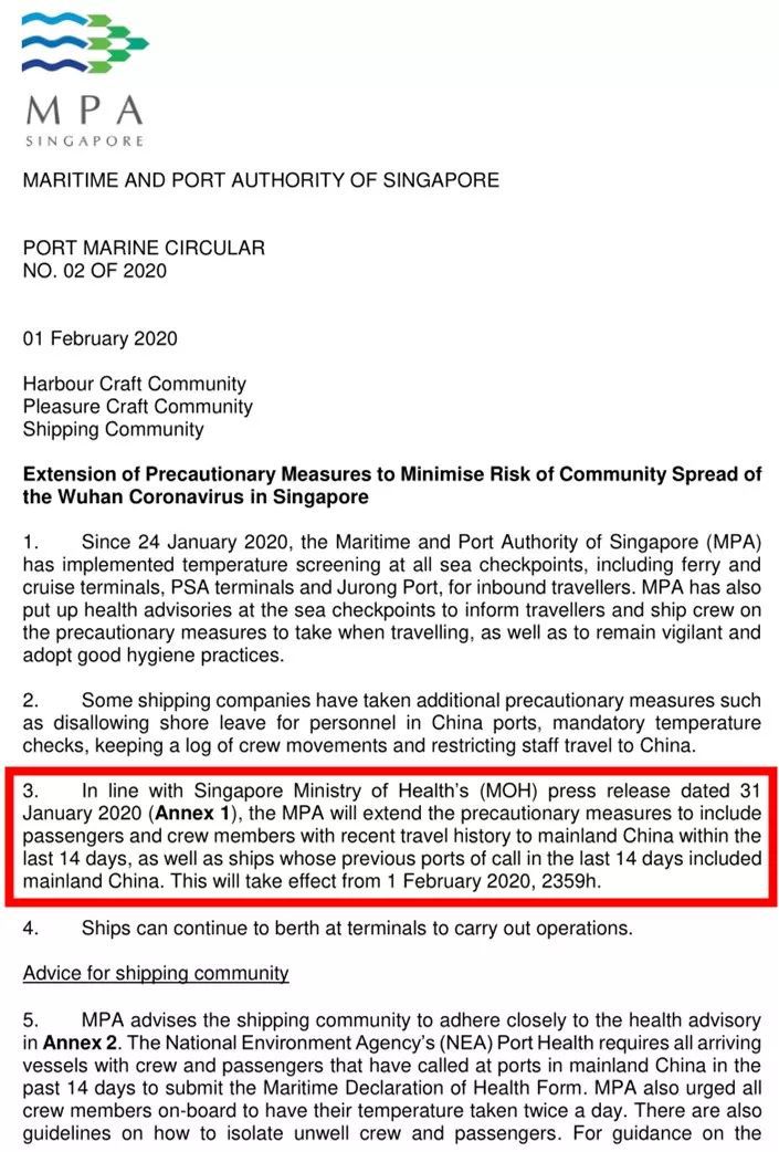 2月1日,新加坡海事和港口管理局(MPA) 连续发布2条公告称,新加坡港对所有14天内靠过内地的船舶增加严格检疫程序。规定适用于:a)所有在过去14天内在中国港口停靠的抵港船只;或b)所有在过去14天内曾前往中国内地的抵港船只及其船员/游客。规定自2月1日23:59时生效,并要求抵港船只必须在到达新加坡港口前24小时将海事健康声明提交给国家环境局(港口卫生处)。