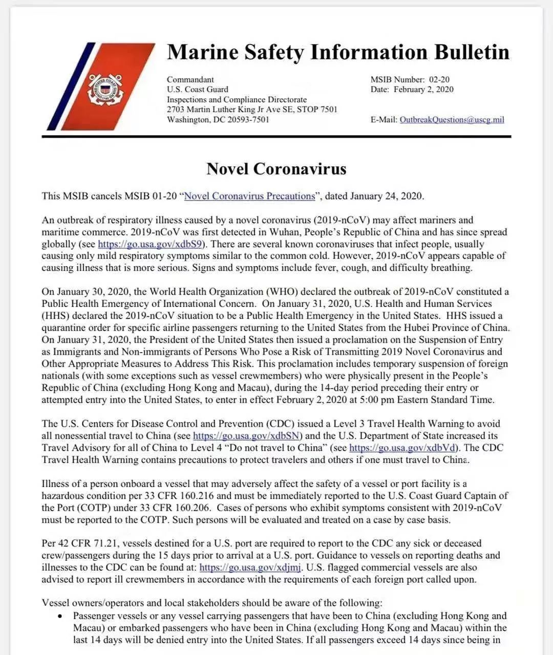 此前有一条引起广泛关注的消息,即对于最近15天内挂靠过中国港口的船舶,且船上没有疑似新型冠状肺炎感染病例等到第16天才能进港。经证实,该信息是虚假的。据Seattle/Tacoma港口向媒体提供的安全公告显示:必须向当地疾控预防中心报告过去15天船员/乘客生病和死亡情况,如果船上有生病船员,登船小组应该向疾病预防控制中心核实船上的疾病。当地官员还必须准备好遵守“船舶检疫和隔离”程序。同时美国海岸警卫队对武汉新型冠状病毒的预防措施也明确表示:只需要将过去15天内船员和乘客的情况根据联邦法规向疾病控制和预防中心报告即可,并未有拒绝停靠的规定。