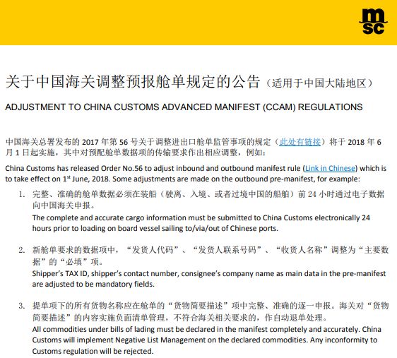 As for cargo imported into mainland China or transited through mainland China, the complete and accurate manifest data of the cargo must be sent to China Customs via electronic data 24 hours before shipment, June 1st, 2018.