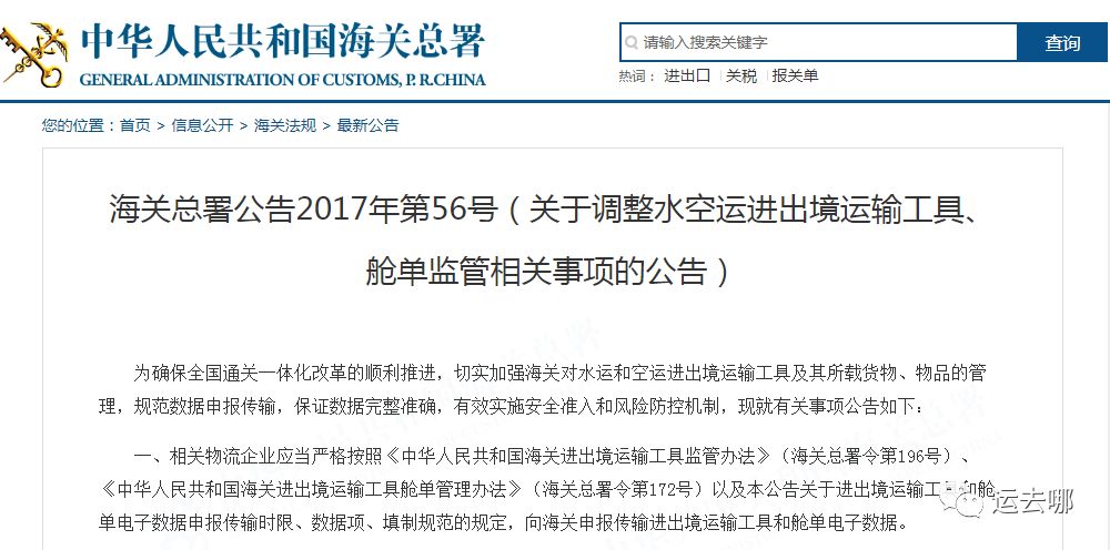 中国海关总署发布的第56号关于调整进出口舱单监管事项的规定将于2018年6月1日起实施。