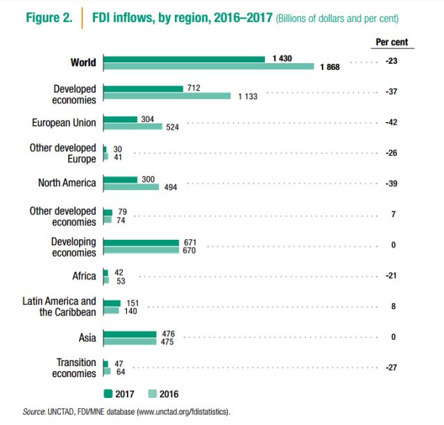 FDI inflows to developing economies remained close to their 2016 level, at $671 billion. Developing economies accounted for a growing share of global FDI inflows in 2017, absorbing 47 per cent of the total, compared with 36 per cent in 2016. Flows to developing Asia remained stable, at $476 billion. The region regained its position as the largest FDI recipient in the world.