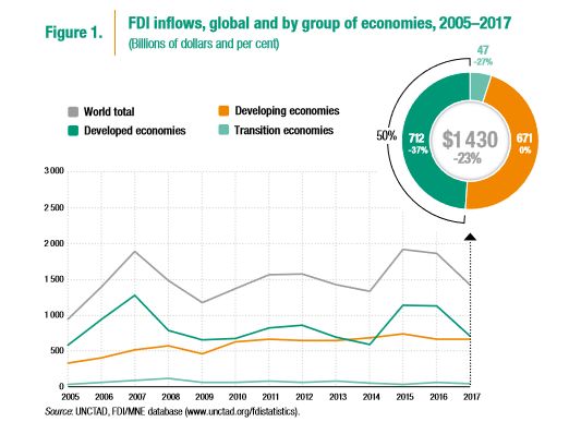 与2017年全球经济和贸易加速增长形成鲜明对比的是,去年全球外国直接投资(FDI)比2016年下降23%,至1.43万亿美元。