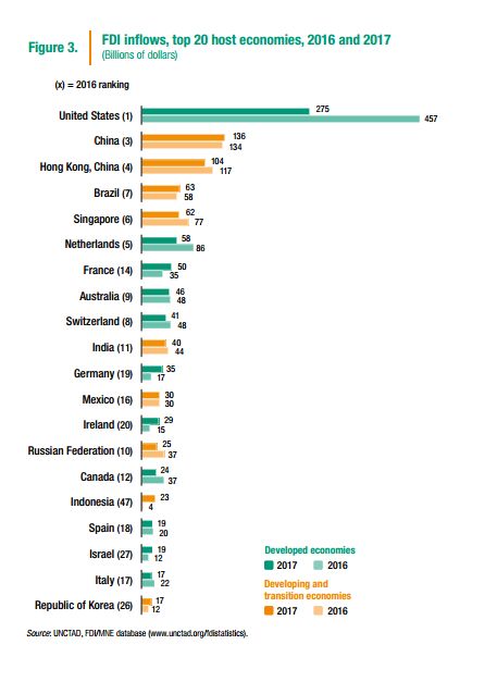 The United States remained the largest recipient of FDI, attracting $275 billion in inflows, followed by China, with record inflows of $136 billion. Inflows to China could see continued growth, as a result of recently announced plans to facilitate and attract foreign investment.
